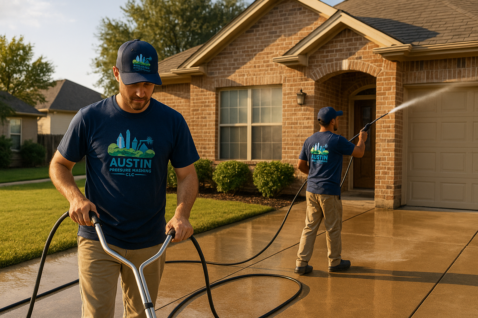 Two workers pressure washing a driveway in front of a brick house, both wearing navy blue shirts and caps with "AUSTIN PRESSURE MASHING CLC" logo.